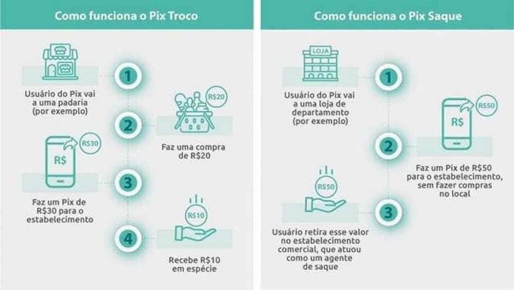 No Pix Saque, o cliente chega ao caixa de um estabelecimento e faz o pagamento no valor referente ao que deseja sacar em dinheiro. Já no Pix Troco, a pessoa compra um produto e, ao pagar, faz uma transferência com um valor maior para receber a diferença em dinheiro.