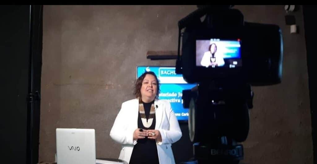 Giordana durante gravação de curso online de Secretariado Jurídico da Bachur Cursos