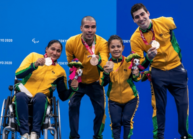 A equipe mista brasileira do revezamento 4×50 metros livre até 20 pontos faturou a medalha de bronze nas Paralimpíadas de Tóquio, nesta quinta-feira, tendo assegurado o terceiro lugar em 2min24s82. A China garantiu o ouro com o tempo de 2min15s49, um novo recorde mundial. E a Itália levou a prata com 2min21s45.
