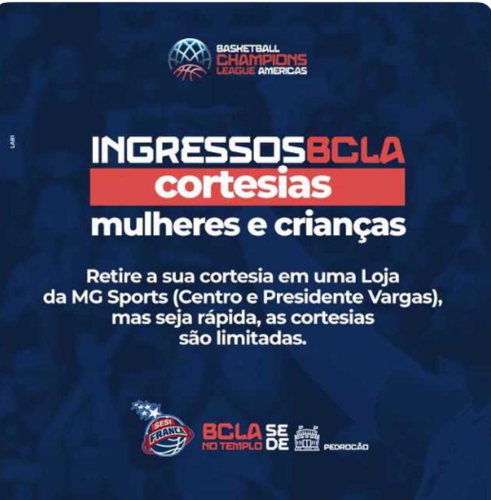 Nos dias 3, 4 e 5 de fevereiro o Ginásio Pedrocão será a sede da terceira fase dos jogos da Basketball Champions League Americas, a BCLA. E, para os três jogos previstos para esse final de semana, mulheres e crianças de até 12 anos vão ganhar uma cortesia para assistir de graça aos jogos no ginásio. As cortesias estão sendo entregues nas lojas MG Sport do Centro ou da avenida Presidentes Vargas.