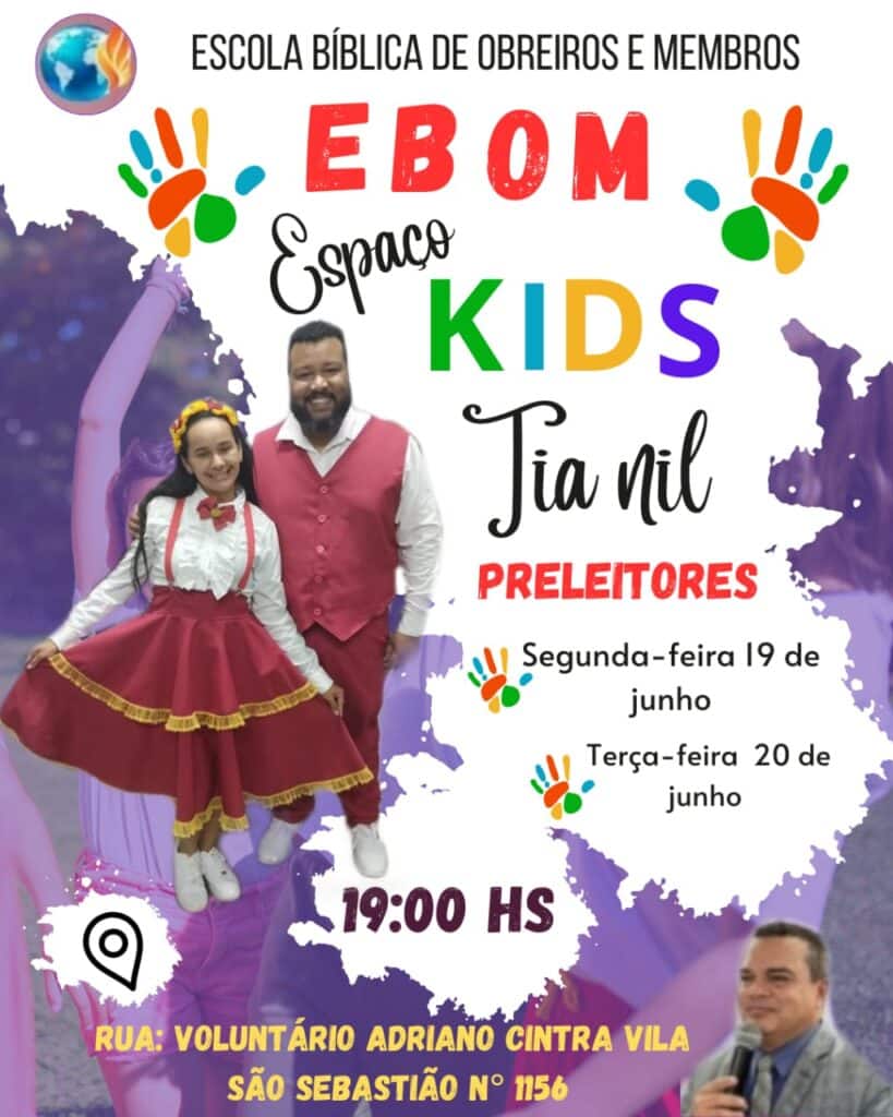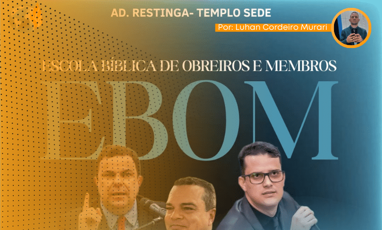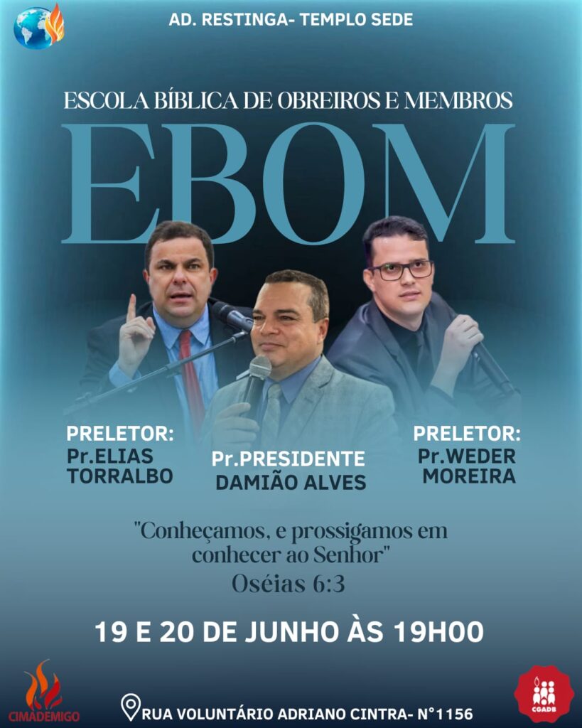 Nos dias 19 e 20 de junho ,a igreja Assembleia de Deus do campo de Restinga com sede em Franca estará realizando a Ebom (Escola Bíblica de obreiros e membros), evento voltado para a área do ensino, chega a sua décima edição e nesta feita tem a alegria de contar com ensinadores na qualidade de: Elias Torralbo, referência na área da palavra reconhecido nacionalmente pelos trabalhos acadêmicos e serviços a igreja do Senhor Jesus Cristo, bem como Pr Weder Moreira, teólogo, pastor e escritor.
