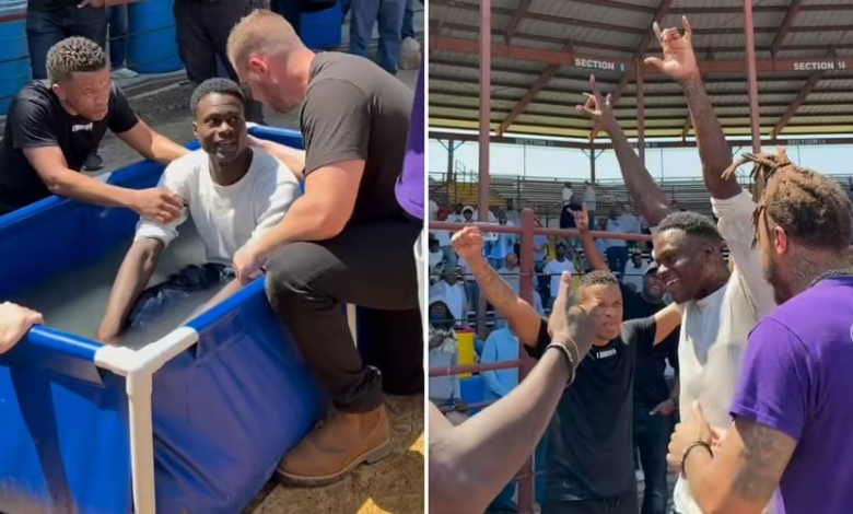 O homem, que cumpre pena perpétua, foi batizado em uma piscina improvisada durante um evento evangelístico, onde outros detentos glorificaram a Deus por sua salvação.