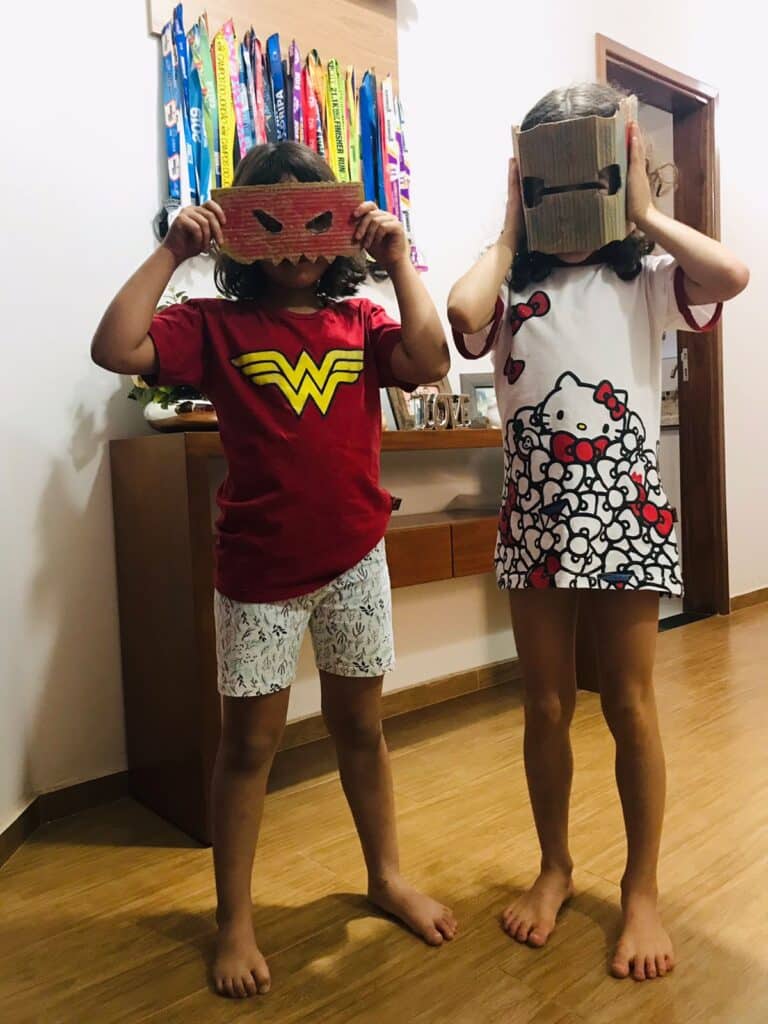 ⦁ Papelão (“Encontramos alguns papelões em nosso passeio no Poliesportivo e tivemos a ideia de fazer as máscaras” – Bia).