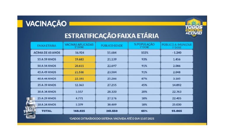 O levantamento apontou ainda que foi cumprida a meta prevista pela Fundação Seade para a imunização dos francanos, com idade acima de 60 anos para a primeira dose. Já o público de 59 a 55 anos, o percentual chega a 93% e 91% das pessoas na faixa etária de 54 a 45 anos que foram vacinadas com a primeira dose.