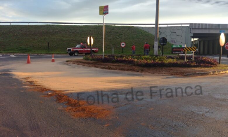 Um caminhão passou pela rotatória do Jardim Alvorada e derramou óleo vegetal pela via, um motociclista já se acidentou, por sorte ele não se feriu.