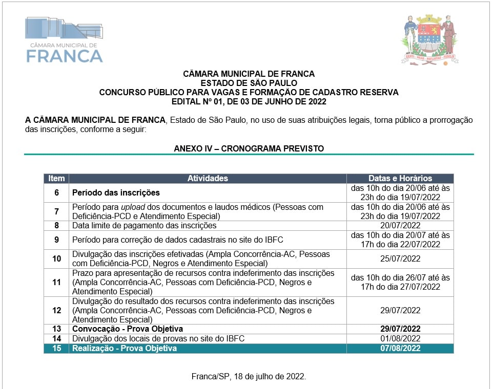 As inscrições para o concurso público para vagas e formação de reserva da Câmara Municipal de Franca foram prorrogadas e poderão ser feitas até às 23 horas desta terça-feira, 19 de julho. Inicialmente o encerramento das inscrições estava previsto para o último domingo, 17, porém após o registro de instabilidade no site da empresa contratada para realização do concurso o prazo foi estendido.