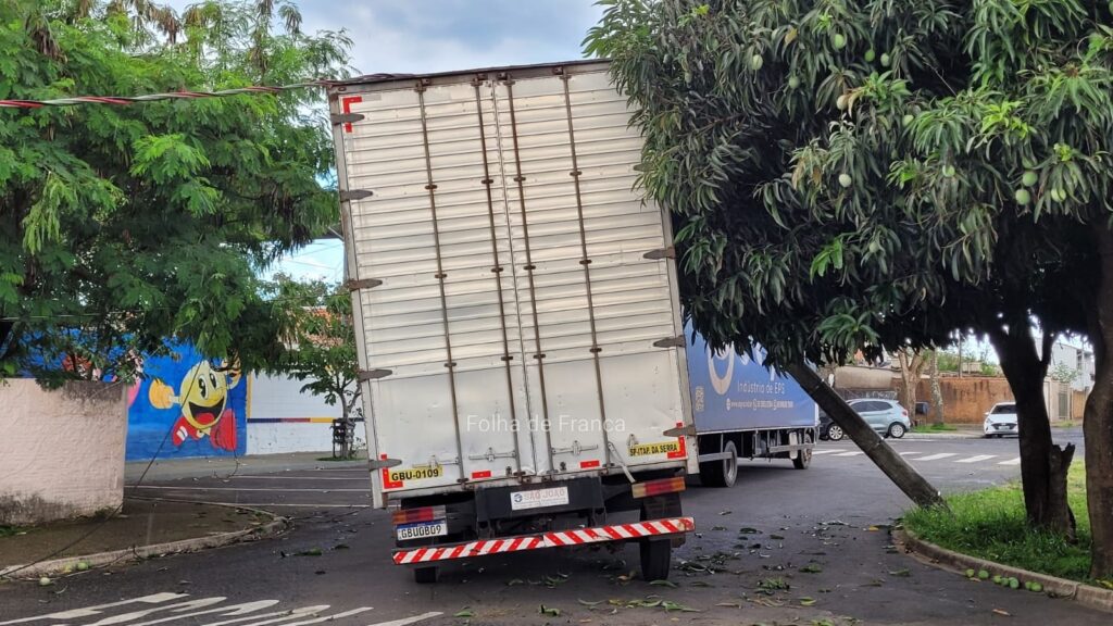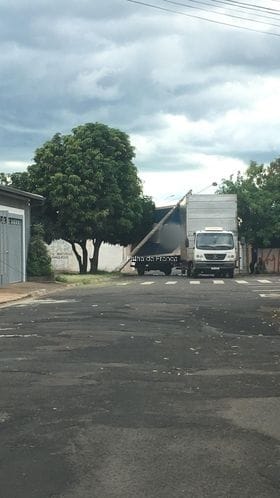 O caminhão tem dois baús. O primeiro passou pela fiação, já o segundo atingiu os fios e ocasionou a queda do poste que ficou sobre o baú.