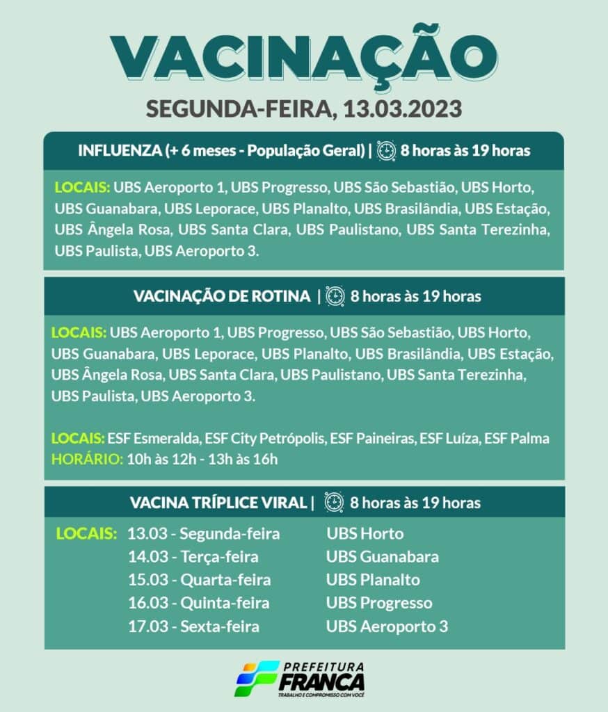Confira a programação da Campanha de Vacinação contra a covid-19 e de rotinas para segunda-feira, 13 de março, até as 19 horas.