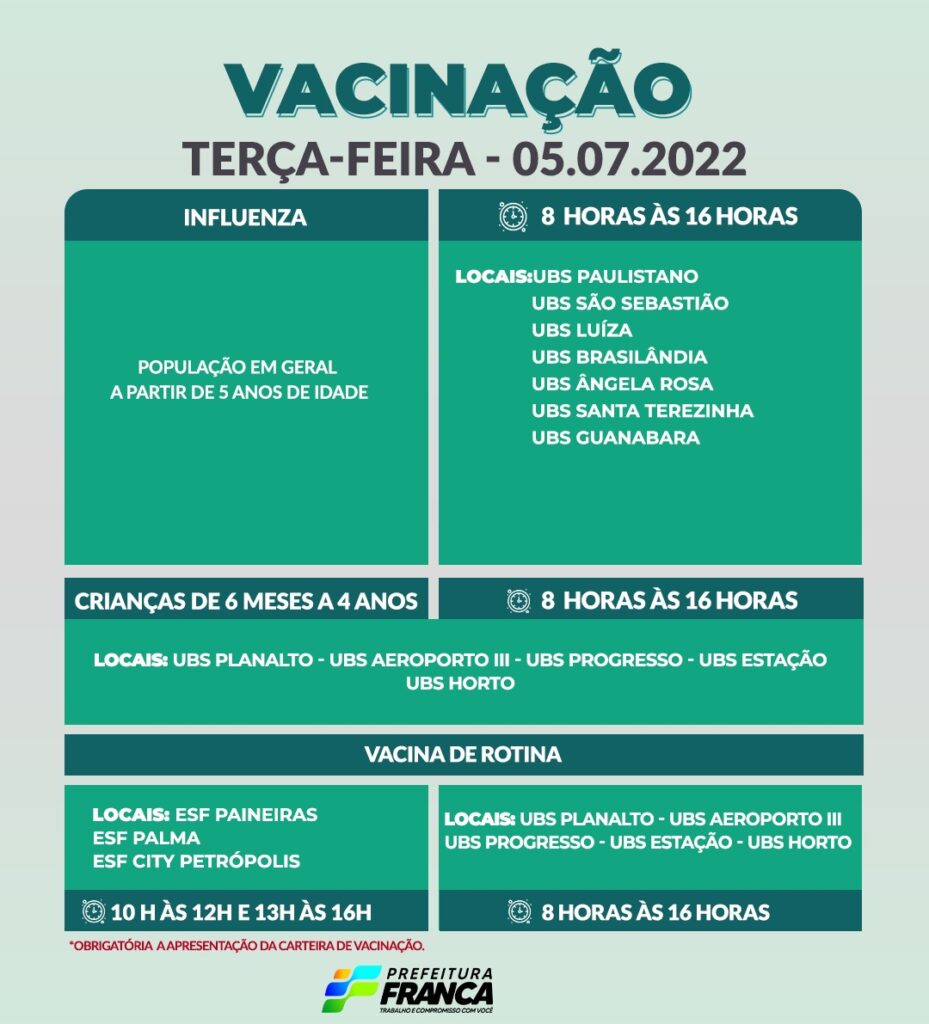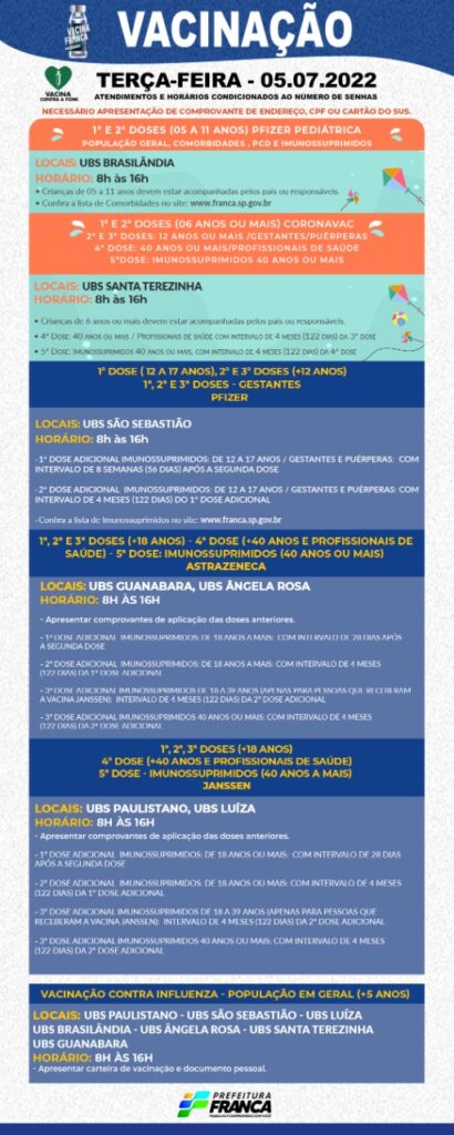 Confira a programação da Campanha de Vacinação contra a covid-19 para esta terça-feira, 5, que contará com 7 Unidades Básicas, atendendo das 8 às 16 horas.