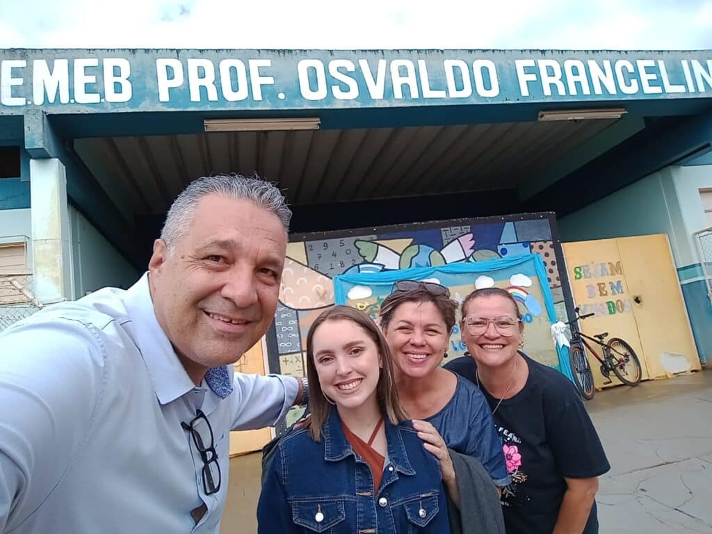 EM Escola de Ipuã, no Distrito da Capelinha: Mambrini, Anna Luiza Calixto, Paula Amaral que é a mãe da Anna Luiza e a acompanha por todo o Brasil; e a diretora da Escola, Fabiana