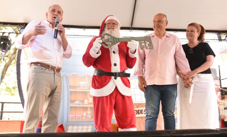 Após sua aparição, o Papai Noel recebeu as chaves da cidade das mãos do prefeito Alexandre Ferreira, cumprindo a tradição. A ocasião foi momento, também, para um importante anúncio. “Quero aproveitar para contar a vocês que, neste ano, em parceria com a ACIF, traremos eventos culturais à praça, que vai estar toda iluminada”, disse o prefeito. A primeira dama Cynthia Milhim participou da entrega.