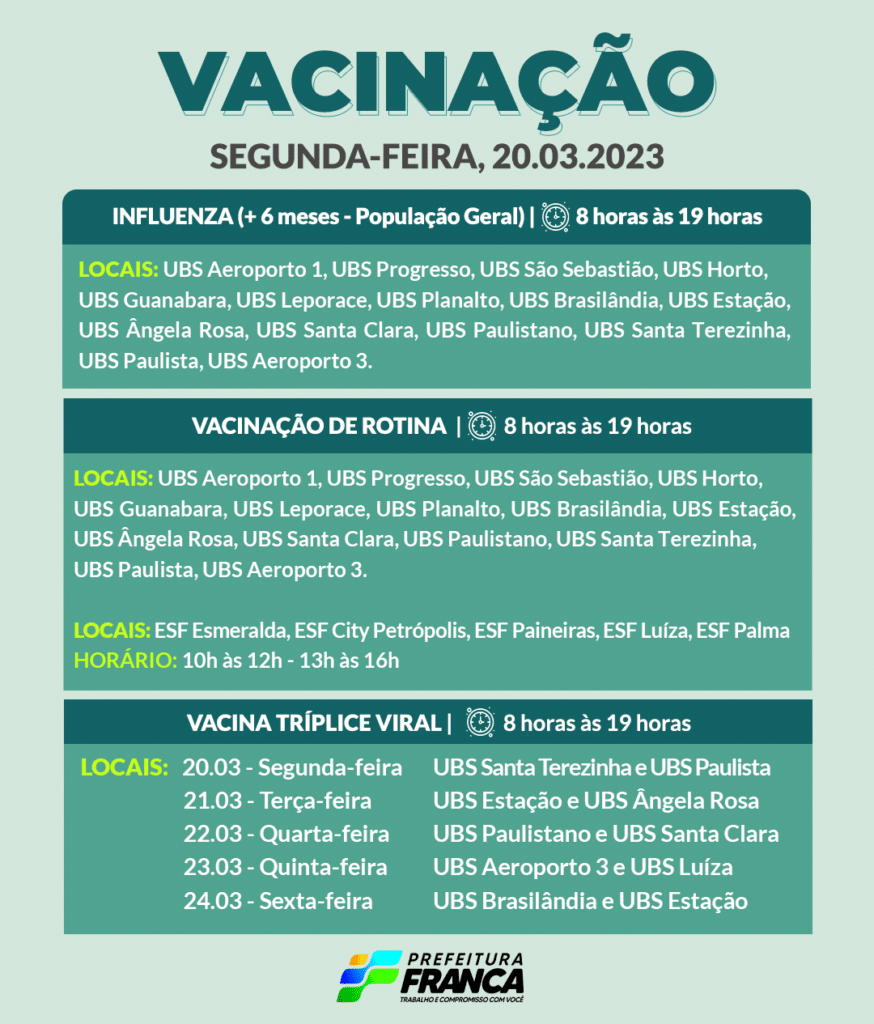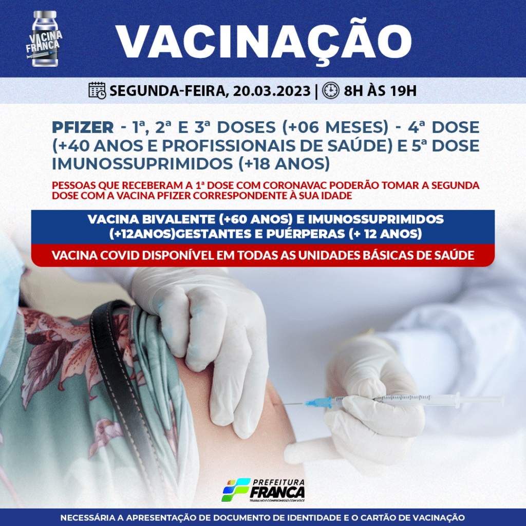 Confira a programação da Campanha de Vacinação contra a COVID-19 e de Rotinas para segunda-feira, 20 de março, no horário das 8 às 19 horas.