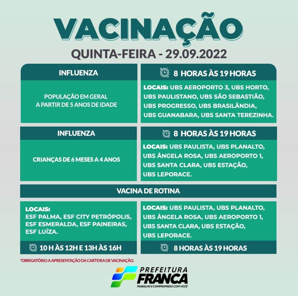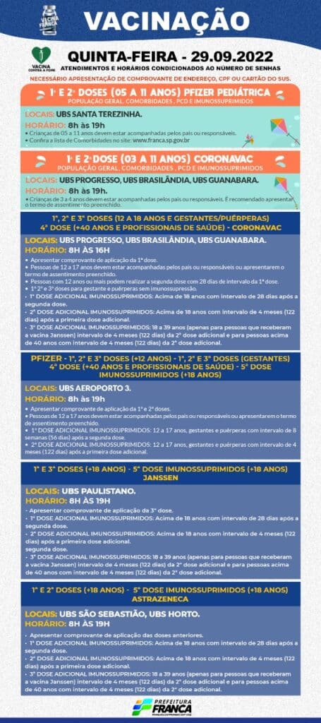 Confira a programação da Campanha de Vacinação contra a Covid-19 para esta quinta-feira, 29, que contará com 8 Unidades Básicas de Saúde, atendendo das 8 às 19 horas.
