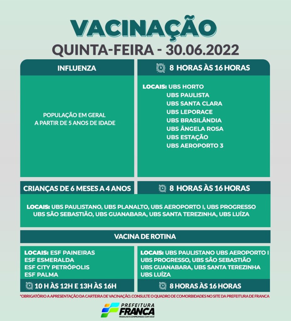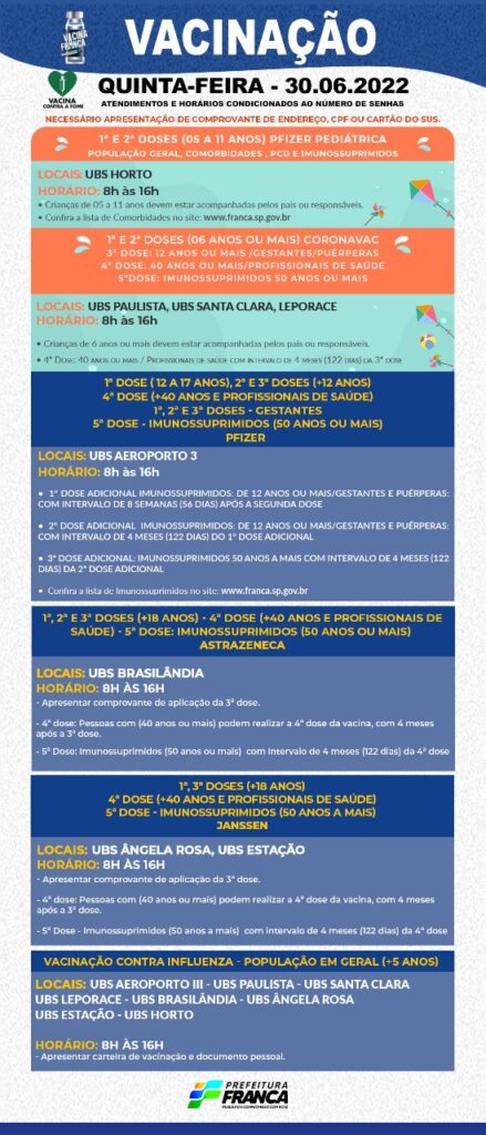 Confira a programação da Campanha de Vacinação contra a Covid-19 para esta quinta-feira, 30, que contará com 8 Unidades Básicas, atendendo das 8 às 16 horas.