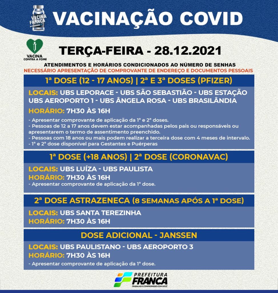 Confira abaixo a relação dos postos e os horários de atendimento para essa terça-feira, dia 28, para a aplicação da primeira dose para pessoas de 12 anos ou mais, gestantes e puérperas, além da segunda e da dose de reforço para os outros públicos.