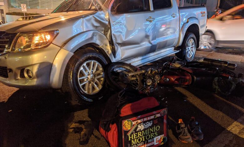 Com o impacto o entregador caiu e fraturou o braço, além de ter ferimentos graves no rosto. Ninguém da caminhonete se feriu.