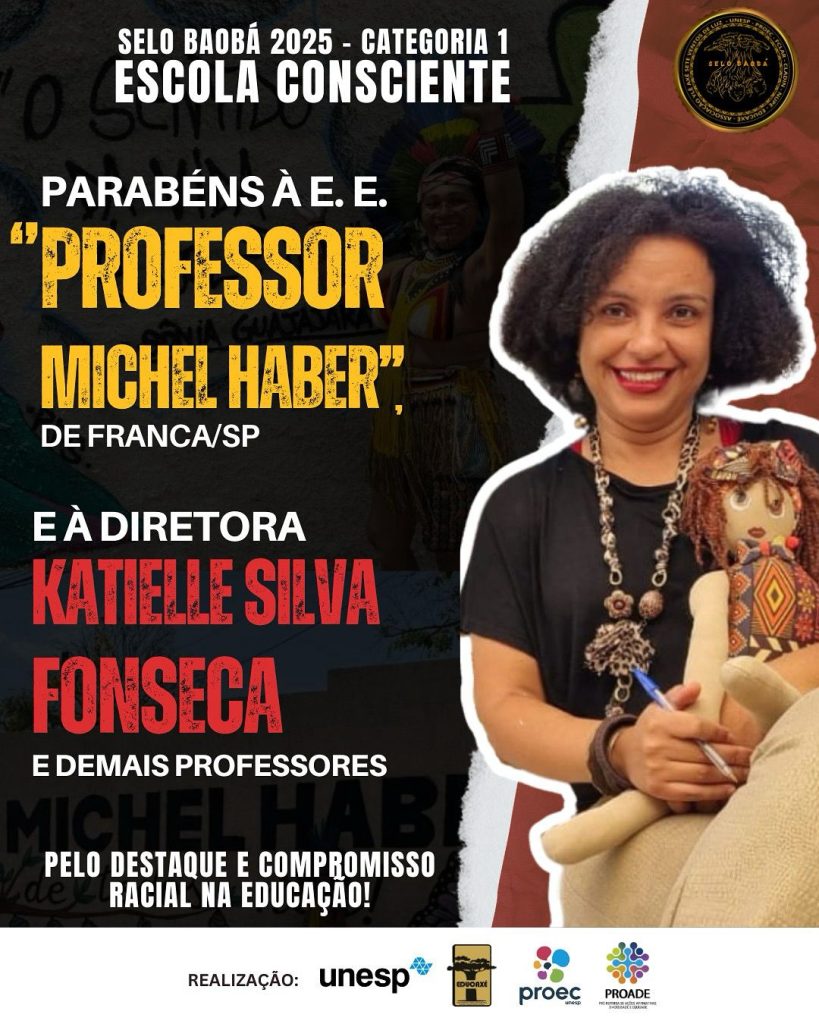 A Escola Estadual Professor Michel Haber foi selecionada para receber a honraria Selo Baobá 2025, como parte da 8ª edição do projeto Afrodescendentes 2025. A distinção reconhece a trajetória da instituição na promoção das relações étnico-raciais, na valorização da educação antirracista e no enfrentamento aos racismos.