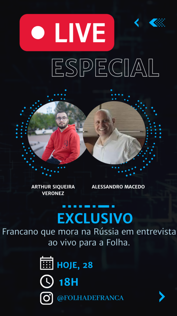 A Folha de Franca entrevistará hoje, 28, no Instagram @folhadefranca, às 18 horas, Arthur Siqueira Veronez. Athur é francano e mora na Rússia de onde vai bater um papo online com o jornalista Alessandro Macedo, sobre o seu ponto de vista a respeito do conflito deflagrado no Leste europeu, entre Rússia e Ucrânia.