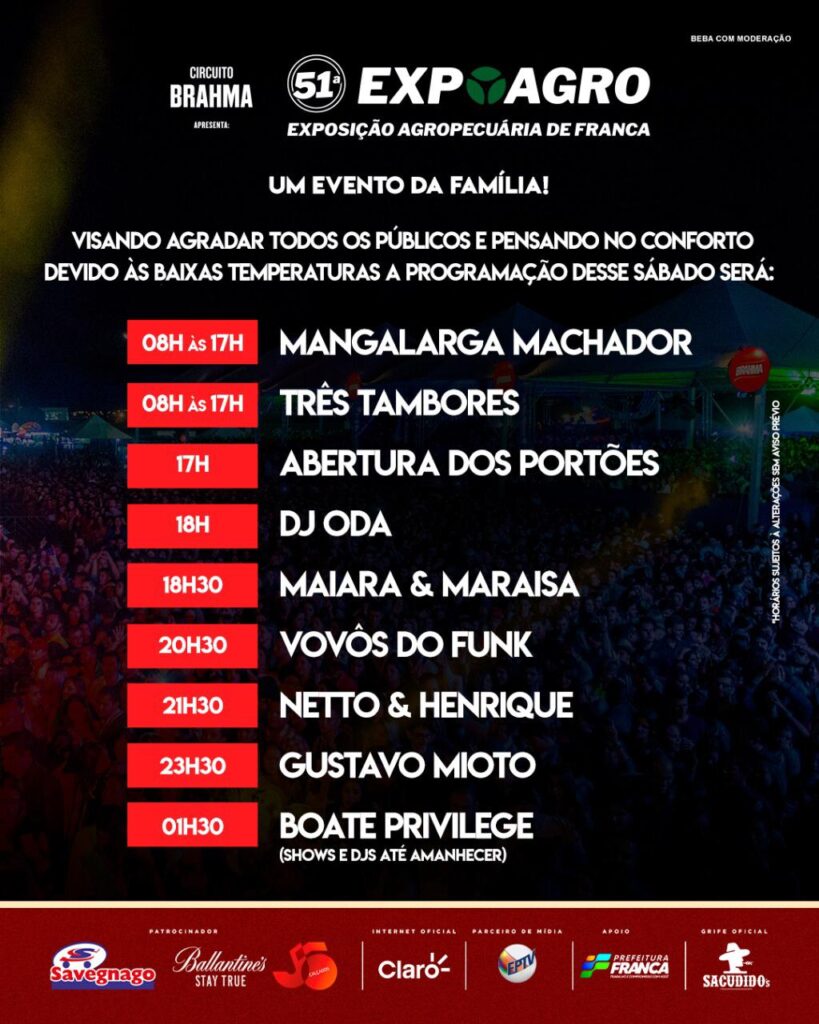 A programação artística da Expoagro 2022, que geralmente têm início às 22 horas, foi antecipada em cima da hora para este sábado, 21. Por conta disso, o show de Maiara e Maraísa foi reprogramado para começar às 18h30 e agitar o público da 51ª Feira Agropecuária de Franca e Região. Em seguida, sobe ao palco a dupla Netto e Henrique para, depois, dar lugar ao cantor Gustavo Mioto. Na madrugada, o agito será na Boate Privilege Music. De acordo com a organização do evento, a mudança dos horários é por conta da onda de frio que tem deixado as temperaturas baixas na cidade.