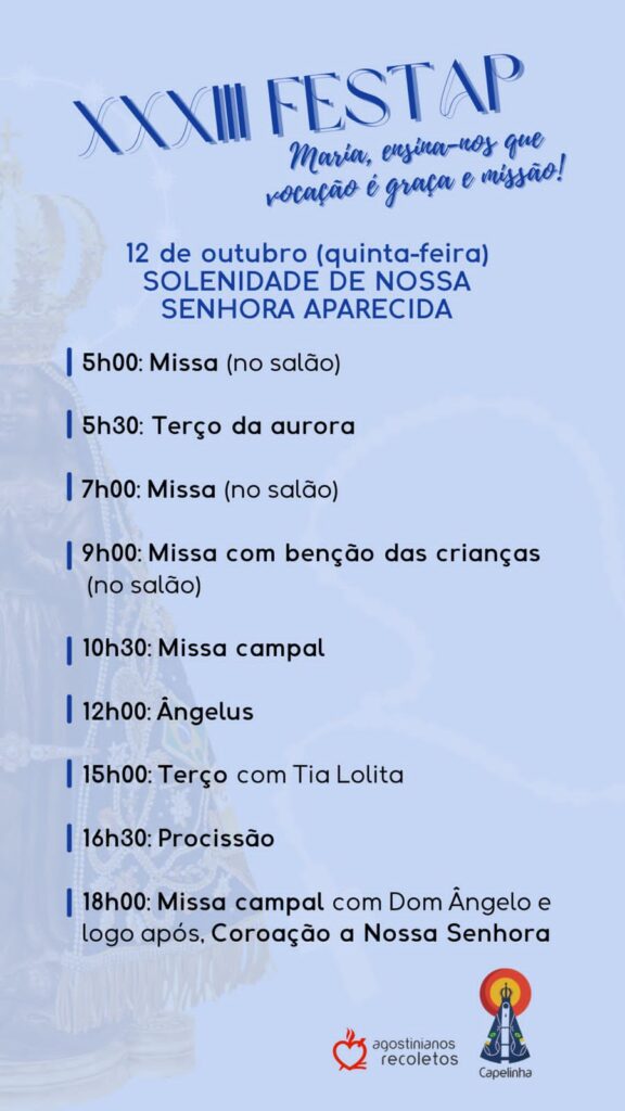 A festa que seguirá nos dias 12, 13, 14 e 15 de outubro, no pátio de eventos da Capelinha. Confira abaixo a programação completa.