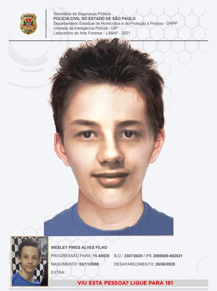 O Laboratório de Arte Forense, do Departamento de Homicídios e Proteção à Pessoa concluiu o trabalho de atualização da imagem do adolescente Wesley Pires Alves Filho. Este procedimento foi realizado com base na fotografia do desaparecido e de seus pais. Mostra como o adolescente estaria hoje aos 15 anos de idade. Quando o adolescente desapareceu, na data de 28.08.2020, ele tinha 13 anos de idade.