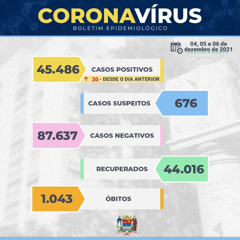 Os dados ainda mostram que foram confirmados 30 novos casos positivos de Covid-19, passando de 45.456 para 45.486 pessoas. Os casos negativos cresceram de 87.348 para 87.637 pessoas.