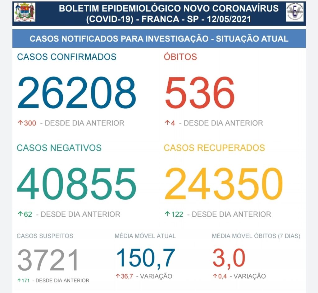 Mais quatro pessoas perderam a luta contra a covid-19 em Franca e morreram nessa quarta-feira, 12. O número de vítimas em decorrência da doença chegou a 536, sendo que somente nos primeiros 12 dias deste mês de maio foram 37, uma média de três vítimas por dia. Todos os pacientes que morreram nessa quarta-feira eram homens e apresentavam comorbidades, segundo a Vigilância Epidemiológica da Prefeitura de Franca. Eles tinham 61, 62, 64 e 69 anos. Não foi informado se eles chegaram a tomar alguma dose da vacina contra a covid-19.