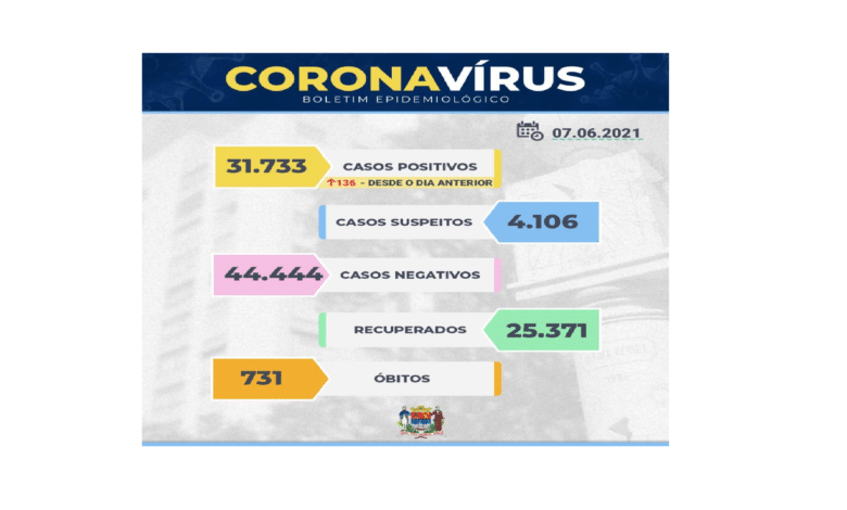 Nesta segunda-feira, 07, também foram confirmados mais 136 casos positivos de coronavírus. Agora são 31.733 pessoas que já foram infectadas pela covid-19 em algum momento desde março do ano passado. Os pacientes recuperados subiram de 25.316 para 25.371 pessoas.