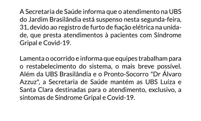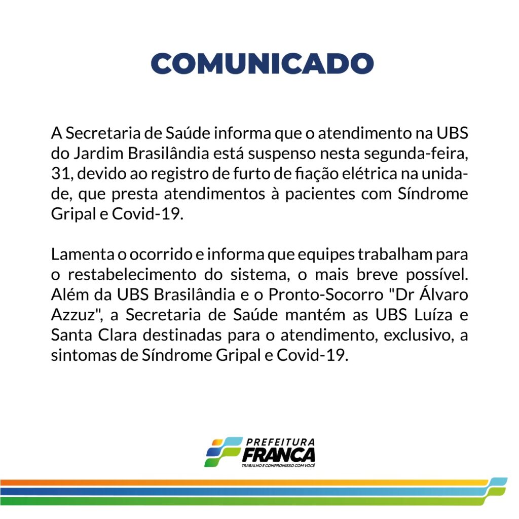 A Secretaria de Saúde de Franca emitiu um comunicado nesta manhã informando que os atendimentos da UBS (Unidade Básica de Saúde) do Jardim Brasilândia está suspenso nesta segunda-feira, 31, devido ao furto da fiação elétrica do local. Os atendimentos da unidade que é referência para a covid-19 e síndromes gripais deverá ser redirecionada para o Pronto-Socorro Dr. Álvaro Azzuz e ainda as UBSs do Jardim Luiza e Jardim Santa Clara. De acordo com a nota, a prefeitura está trabalhando para restabelecer o energia elétrica no local.