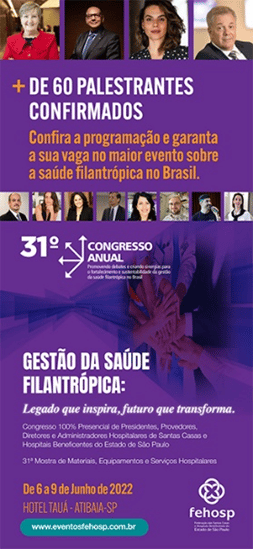 Uma das entidades é a FEHOSP (Federação das Santas Casas e Hospitais Beneficentes do Estado de São Paulo) que convidou a diretoria administrativa do Grupo Santa Casa para fazer parte do 31º Congresso Anual, que é um evento de grande importância, apresentando mais de 60 palestrantes que irão tratar de assuntos que envolve assuntos como “Gestão de Saúde Filantrópica”. O congresso acontece em Atibaia-SP, entre 6 e 9 de junho.
