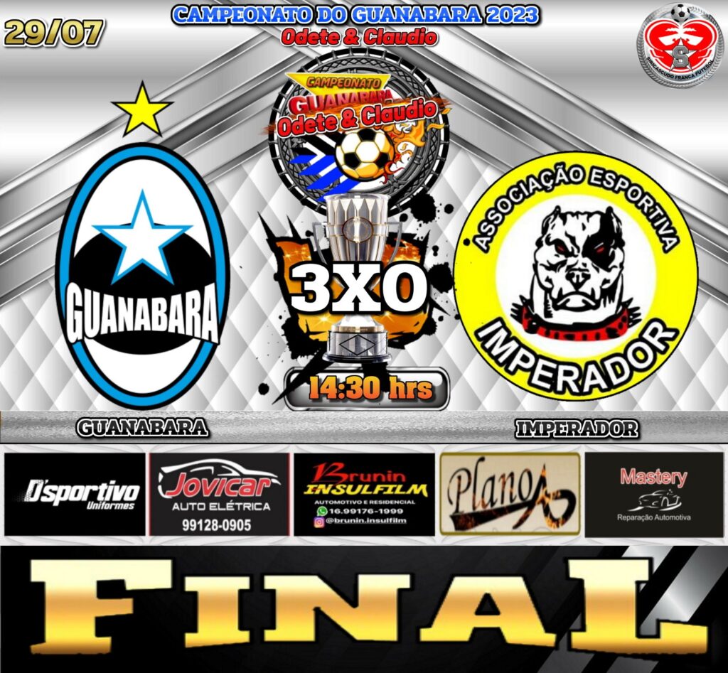 Chegou ao final, no sábado, o Campeonato Guanabara e o grande vencedor da competição foi o time que tem o mesmo nome do torneio: Guanabara. Organizado por Cláduio e Odete há muitos anos, esse ano o campeonato consegiu reunir 15 equipes. “Foi um campeonato muito equilibrado e muito organizado e é muito bom ver as família comparecendo, se divertindo. Foi um espetáculo no sábado. Parabenizo a Odete eo Cláudio, pois deu tudo certo. Agradeço a todos que compareceram, que torceram e vibraram por seu time. Foi tudo em paz, estão todos de parabéns. Festa linda”, disse Pablo Henrique, que é o presidente da A.E. Imperador, o Pitt Bull; que foi a equipe vice-campeã.