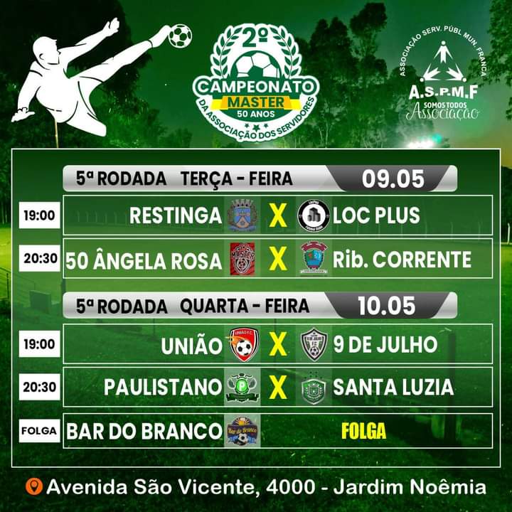 E hoje é dia de mais uma rodada de jogos do segundo Campeonato Master da Associação dos Servidores Públicos. A presidente da Associação, Fátima de Carvalho, está feliz com a movimentação que os jogos tem trazido e faz o convite para todos: “Reúna seus amigos e venha torcer pelo seu time no Clube dos Servidores. A entrada é gratuita para todos os torcedores, então não há desculpas para ficar em casa!”.