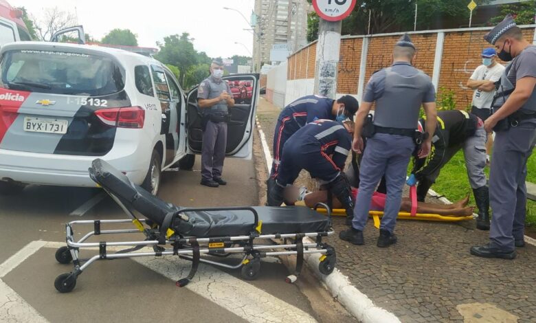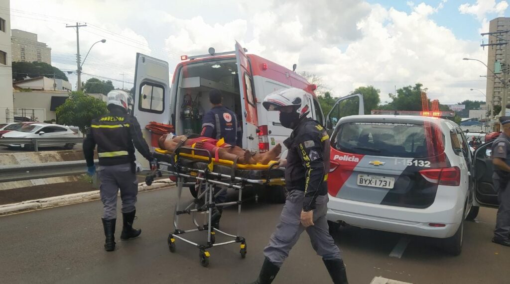Uma ambulância do Samu foi acionada e o rapaz de 29 anos que estava muito agitado foi socorrido até a Santa Casa com uma fratura na clavícula e escoriações.