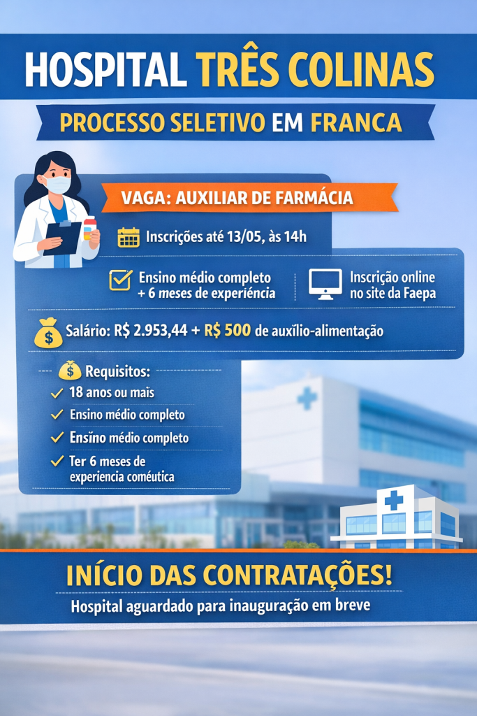A Fundação de Apoio ao Ensino, Pesquisa e Assistência (Faepa), responsável pela gestão do Hospital Estadual Três Colinas, abriu o primeiro processo seletivo em Franca. A iniciativa marca o início da formação da equipe que irá atuar na nova unidade hospitalar, considerada uma das mais aguardadas da região.