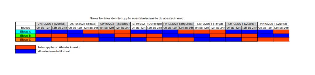 Confira a distribuição dos bairros nos blocos A, B e C e confira no quadro os dias e horários que sua residência ou comércio estará sem abastecimento: