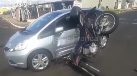 Moto fica de ponta cabeça em acidente com carro na avenida Eliza Verzola Gozuen