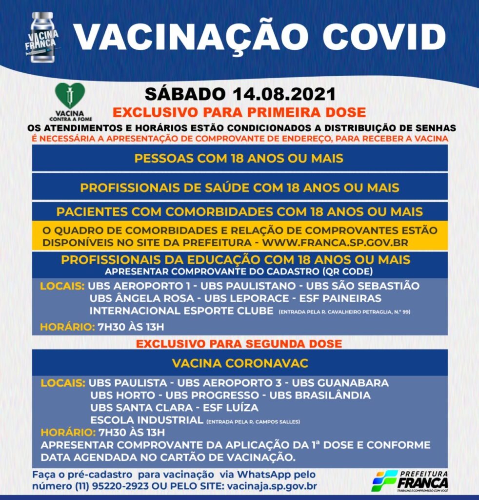 A Secretaria de Saúde de Franca começa amanhã, sábado, 14, a vacinar jovens a partir de 18 anos de idade. A imunização será feita em mais um Mutirão de Vacinação contra a covid-19. A campanha deste sábado também para aqueles que já completaram o intervalo de 28 dias e estão aptos a tomar a segunda dose da Coronavac. Para atender exclusivamente os jovens com 18 anos ou mais, além de pessoas com comorbidades e profissionais da Educação e Saúde que ainda não foram vacinadas, estarão disponíveis sete postos de atendimento, das 7h30 às 13 horas: UBSs (Unidades Básicas de Saúde) Aeroporto I, Paulistano, São Sebastião, Ângela Rosa, Leporace, Paineiras e o Internacional Esporte Clube, na Estação.