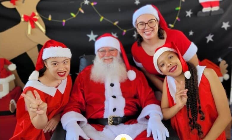Um dos pontos altos foi a chegada do Papai Noel, que trouxe magia e encantamento ao mês de dezembro. A festa contou ainda com as alunas noeletes e os personagens Mickey, Minnie e Pateta com trajes natalinos, em um ambiente repleto de alegria e inclusão.