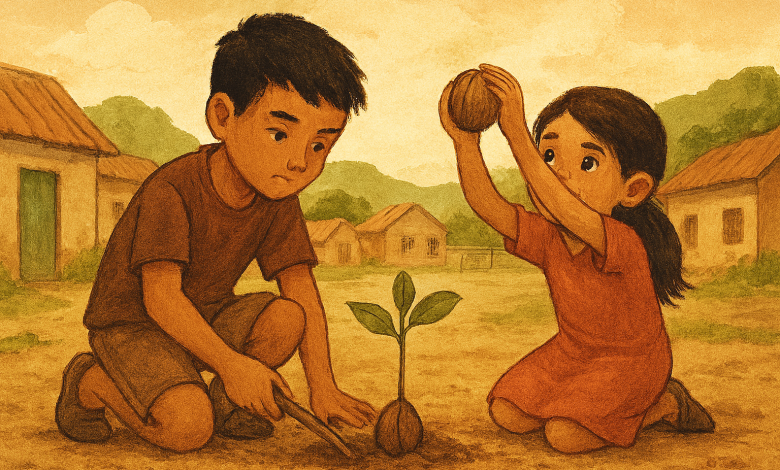 Demorou alguns minutos, mas logo Mangotinha voltou, sofrendo para carregar uma jarra de água que teimava em entornar sobre seus pés. Ajoelhou ao lado do irmão e, com sua orientação, umedeceu a terra, revolvendo e colocando a semente para se aninhar quietinha.