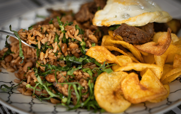 O prato leva arroz, feijão, bacon e couve acompanhados de bife, ovo e jiló fritos e mais batata frita. “Conheci esse prato na praça central de Belo Horizonte e quando resolvi abrir o restaurante em Franca, resolvi criar uma versão mais simples e barata que pudesse atender os funcionários das lojas do Centro”, disse dona Maria.