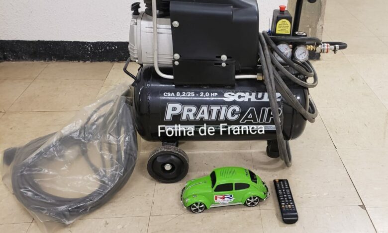 Os policiais verificaram que os produtos, um compressor, uma extensão, um controle remoto de TV e uma miniatura de fusca com a logomarca RR MULTIMARCAS, haviam sido furtados de um estabelecimento comercial. No local, os PMs confirmaram que o portão de entrada do estabelecimento estava arrombado, assim como a janela do escritório.