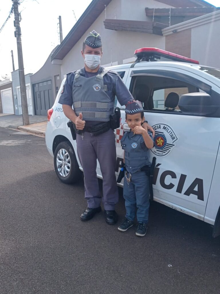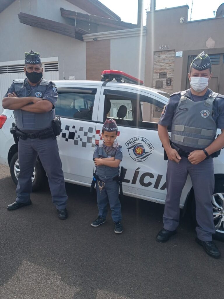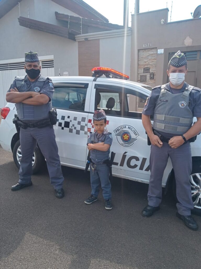 Com uma farda idêntica à da PM, o garotinho aguardou a chegada das equipes. Os policiais Sargento Pimentel, Cb Tiago, Cb Sobrinho, Sd Saulo e Sd Rabelo da 1ª Cia por alguns instantes deixaram de lado a dura rotina de patrulhar, para surpreender a criança que sonha em ingressar na Polícia Militar e ainda trouxeram um complemento para sua mini farda.