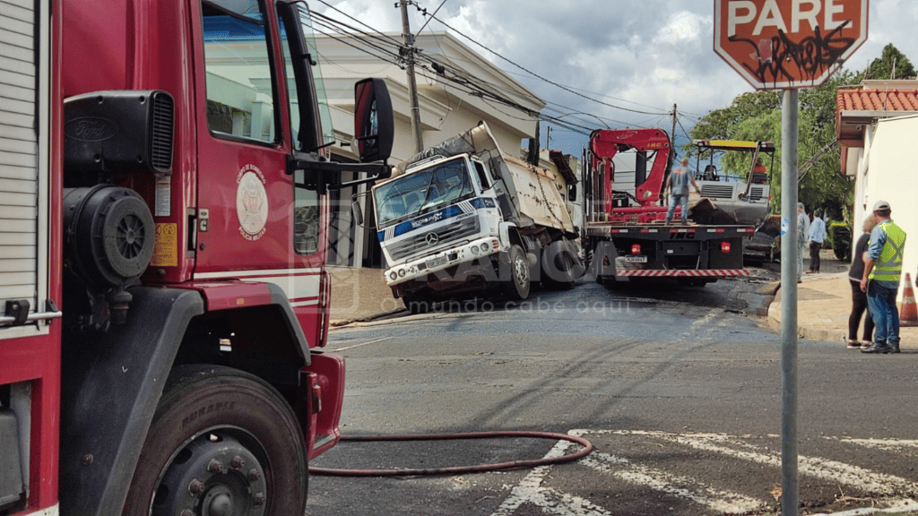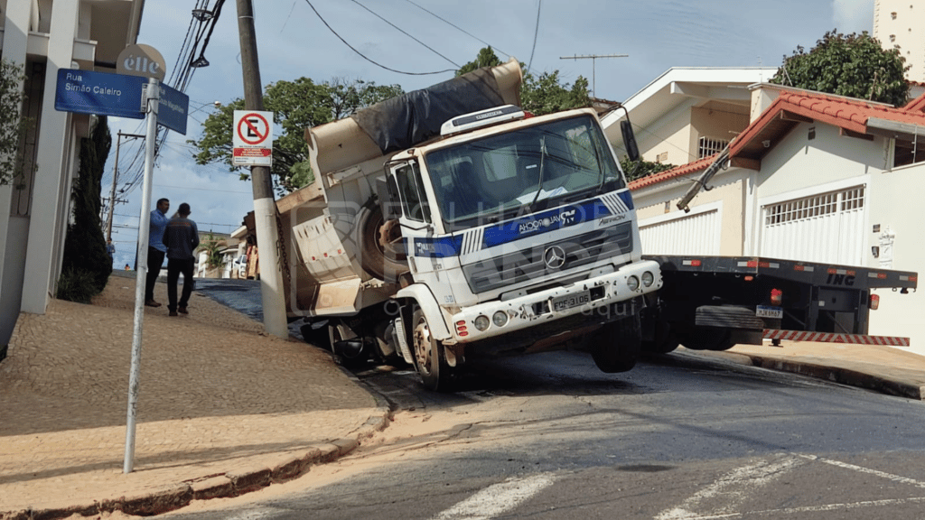 Um caminhão carregado com 25 toneladas de asfalto ficou preso em um buraco no asfalto que cedeu com o seu peso na tarde desta terça-feira, 14. O acidente ocorreu na rua Couto Magalhães, área central de Franca.