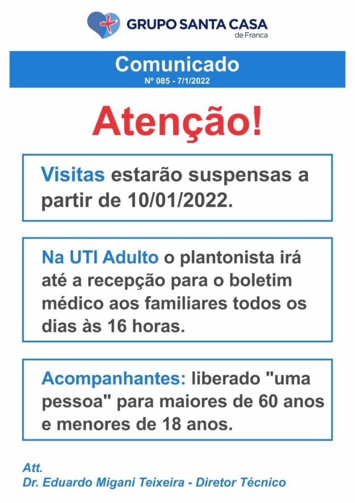 A Santa Casa de Franca divulgou na tarde desta segunda-feira, 10, um comunicado oficial com medidas restritivas após o aumento de casos de Covid e Influenza na cidade.