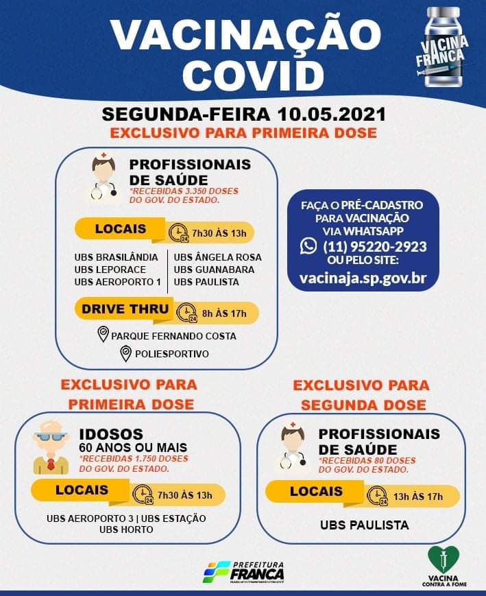 A Secretaria de Saúde deu início nesta segunda-feira, 10, a imunização dos profissionais de saúde que ainda não foram vacinados na cidade. Para atender este público nesta etapa a Prefeitura recebeu 3.350 doses do Governo do Estado de São Paulo. Oito postos de vacinação receberão estes atendimentos, sendo seis UBSs (Unidades Básicas de Saúde): Brasilândia, Leporace, Aeroporto I, Ângela Rosa, Guanabara e Paulista, até às 13 horas; além dos dois postos de drive thru, no Poliesportivo e o Parque “Fernando Costa”, até às 17 horas. Assim como tem sido feito nas últimas semanas, o atendimento será prestado através da distribuição de senhas e a disponibilidade das doses. Para agilizar o atendimento, a orientação é para que as pessoas façam o pré-cadastro pelo Whatsapp (11) 95220-2923 ou pelo site www.vacinaja.sp.gov.br.