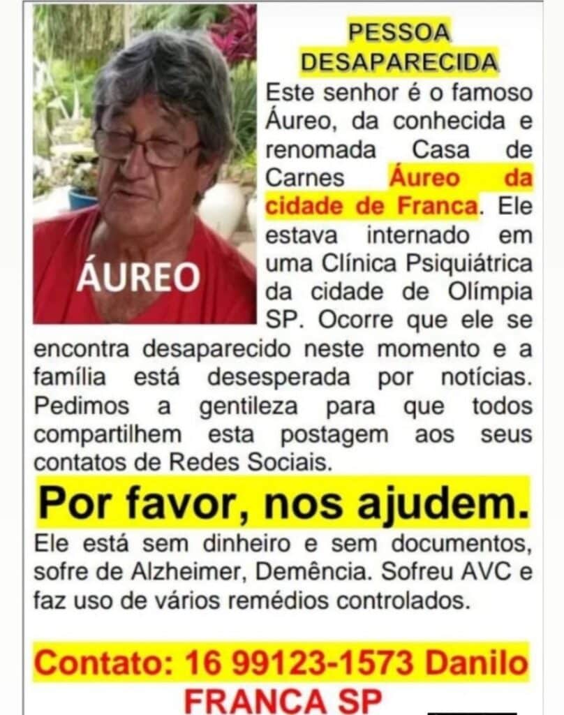 A família de Áureo Danilo Fontanezi está desesperada. O idoso, de 74 anos, está desaparecido desde sexta-feira, dia 17, e os famíliares não têm nenhuma notícia dele. ‘Sêo’ Áureo é conhecido em Franca, por conta de seu açougue, a Casa de Carnes Áureo, que ele manteve em funcionamento por muitos anos na cidade. Sêo Áureio está com começo de Alzheimer e estava internado numa clínica de Olímpia. Foi de lá que ele sumiu, na manhã da última sexta.