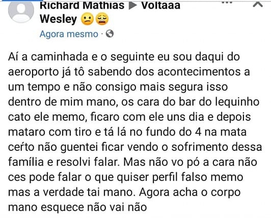 Uma postagem anônima em uma página nas redes sociais está movimentando novamente a população de Franca sobre o paradeiro de Wesley Alves Pires Filho, 15 anos, desaparecido desde 28 de agosto de 2020. De acordo com o texto publicado em uma página intitulada “Voltaaa Wesley” um perfil com o nome de Richard Matias afirma que o garoto foi morto a tiro e que o corpo estaria em uma mata nos fundos do bairro Jardim Aeroporto 4. No texto ainda há elementos sobre o local onde Wesley teria ficado por alguns dias mantido refém por bandidos. O próprio “Richard” confirma ser um perfil falso para poder realizar a denúncia. A polícia ainda não se pronunciou oficialmente sobre esta suposta denúncia.