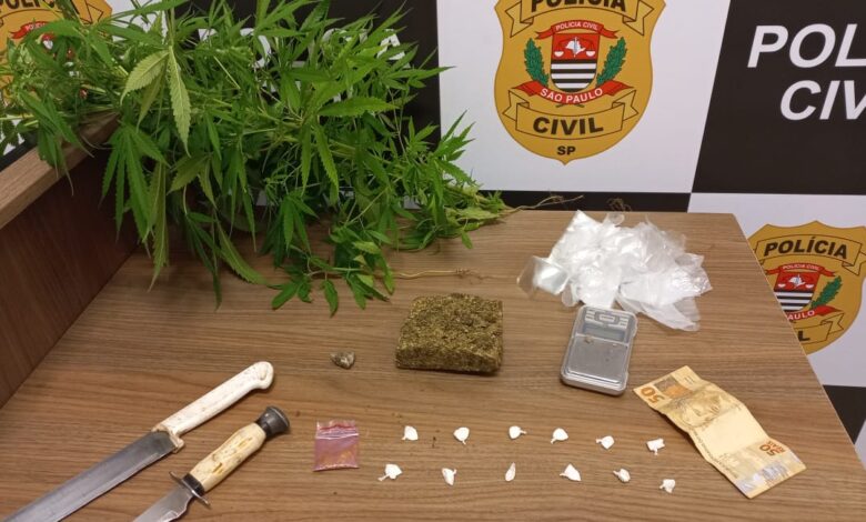 Com o autuado foi localizado uma pochete com meio tijolo de maconha, 12 porções de cocaína, 2 pedras de crack, 13 pinos de cocaína, 2 porções de maconha, 4 pés de maconha, balança de precisão, 1 embalagem contendo ecstasy, embalagens, 2 facas e 1 soco inglês.