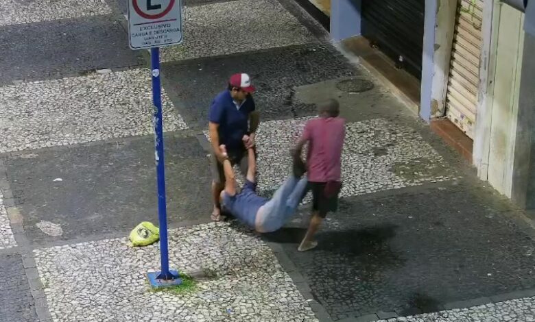 Outro homem aparece na praça e, com a ajuda do morador de rua, carrega o idoso até a porta de uma loja. Em seguida a dupla começa a mexer em uma sacola da vítima. Entre os objetos, estava a carteira do idoso, que é vasculhada por um dos homens, que parece subtrair cartões. Outros homens se aproximam do idoso.