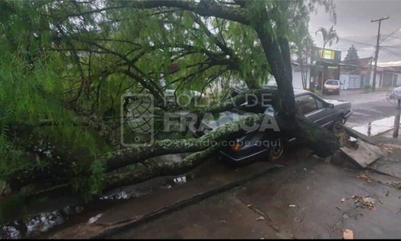 Durante a forte chuva que caiu na tarde desta quarta-feira, 29, em alguns bairros de Franca, uma árvore caiu e danificou parte de um veículo que estava estacionado na rua Realindo Jacinto Mendonça.